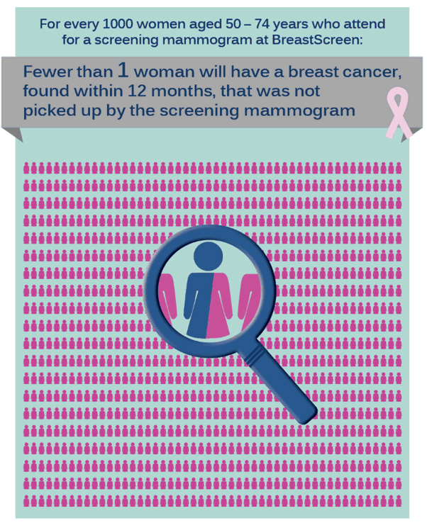 For every 1000 women aged 50 – 74 years who attend for a screening mammogram at BreastScreen, fewer than 1 woman will have breast cancer found within 12 months, that was not picked up by the screening mammogram: (Ref. BreastScreen Australia)